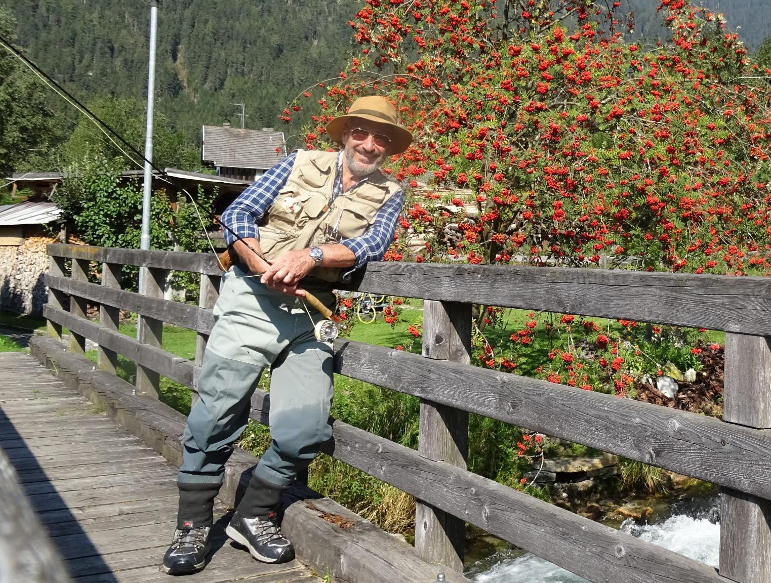 Ornato da innumerevoli alberi vermigli del Sorbo degli Uccellatori il torrente scorre impetuoso, le gambe tremano nella corrente, lo sguardo teso a osservare il terminale della lenza per cogliere l’oscillazione che rivela l’ attacco della preda.
